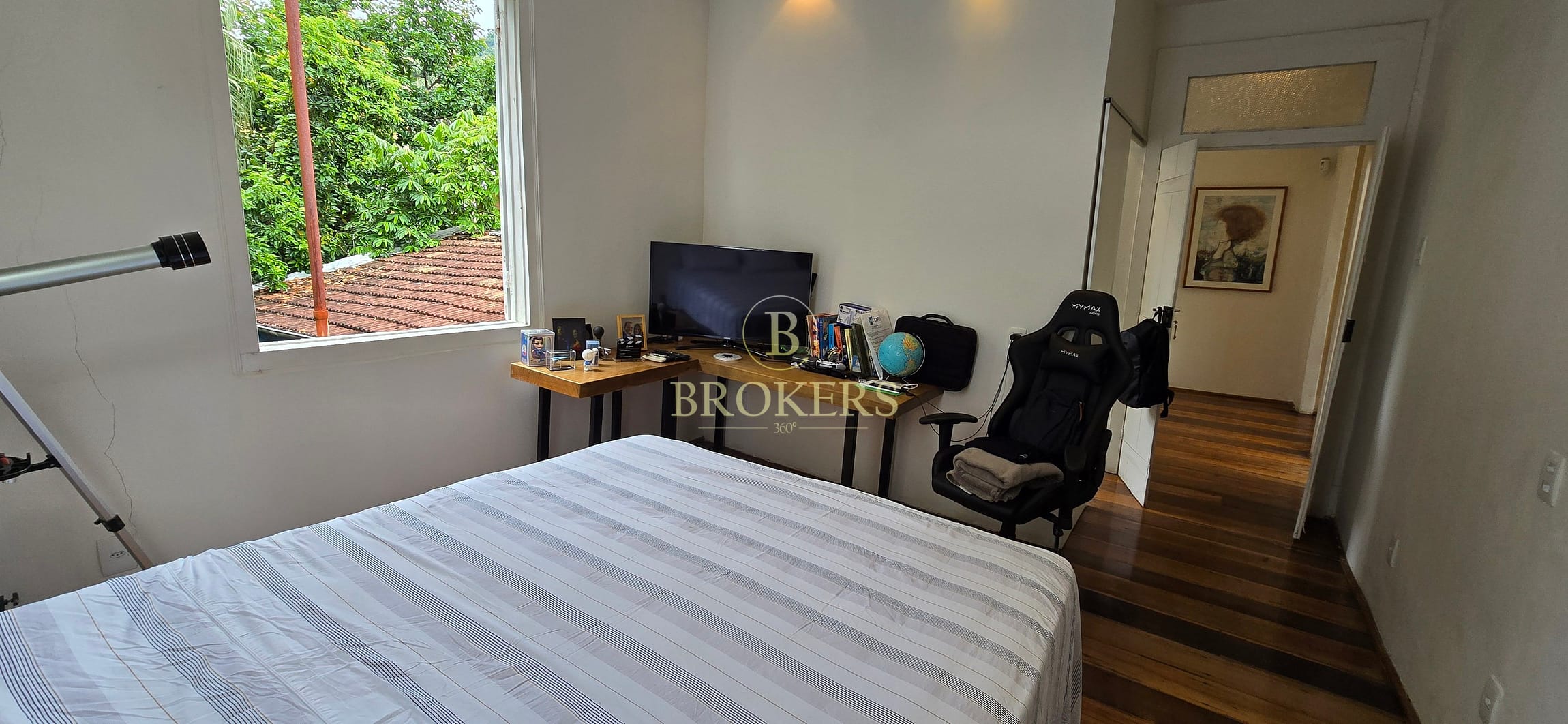 Quartos: O segundo quarto deste andar oferece uma vista relaxante para a área externa, emoldurada por uma frondosa árvore de Sapoti.